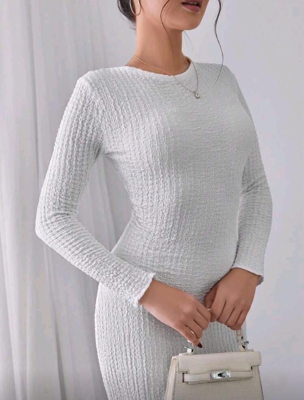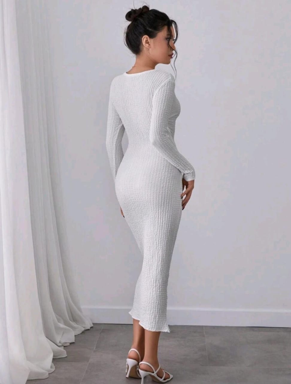 Cast in pristine White, the VERVE Sculpted Knit Dress offers a refined texture and disciplined silhouette. Designed for quiet confidence, it drapes impeccably, embodying effortless sophistication for any moment.